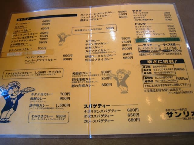 2010-11-04 汗がじんわり、、『サンリオ』でランチ グルメ 美味しい(辛~い)カレーを探して、、、、、 柳丸にある「サンリオ」に行ってみました ビーフカレー600円~ 専門店らしく豊富なメニュー どでかいお皿が標準のようです 調子に乗ってカツカレー大盛り&辛さ10倍で 1050円 これで、臨時収入財源は破綻です、、、、、、、、、、、、 揚げたてサクサクのカツ 後からじんわりと辛くなって、食べ終わる頃は汗がじんわり、、 値段が同じなら20倍にしとけば良かった、、、大盛り200円はもう少し頑張って欲しいかな、、 かなり前からこの地にあります 常連さんが多いみたいでした サンリオ 宮崎県宮崎市柳丸町135-2 0985-26-0380